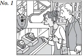 まず、問題用紙に印刷されたイラストを見ながら、男女2人の短い会話を聞きます。そして、会話の最後の発言に対する最も自然な応答を、音声で放送される3つの選択肢の中から選ぶ形式です。