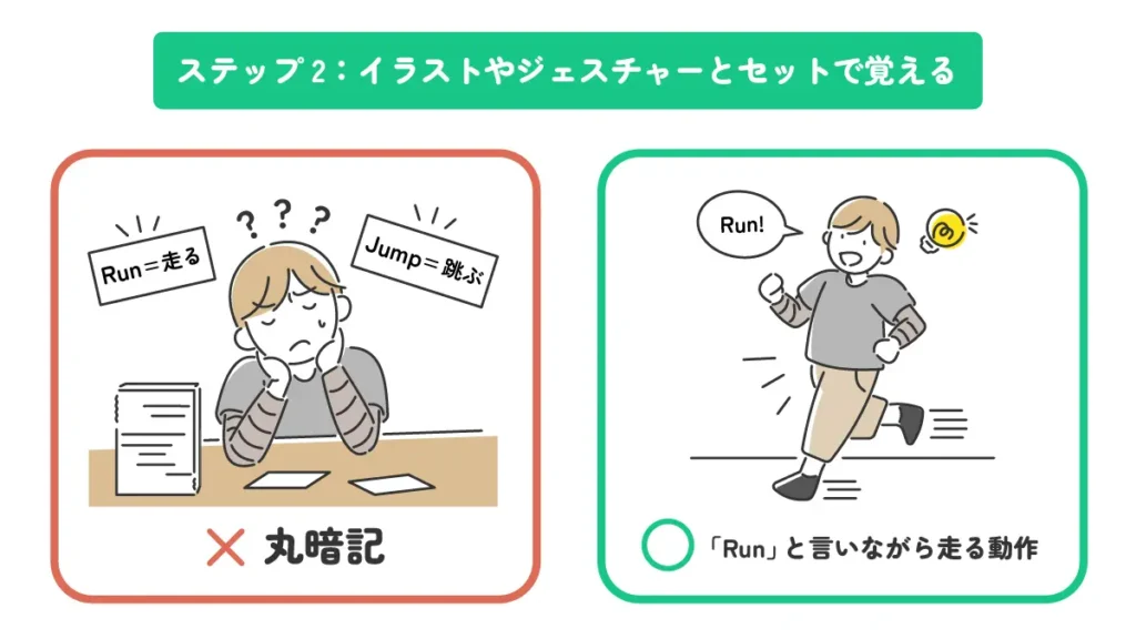 英単語はイラストや動作とセットで覚えましょう。例えば「Run」と言いながら走るポーズをとるなど、ジェスチャーを使う方法は小学生でも楽しく取り組めます。