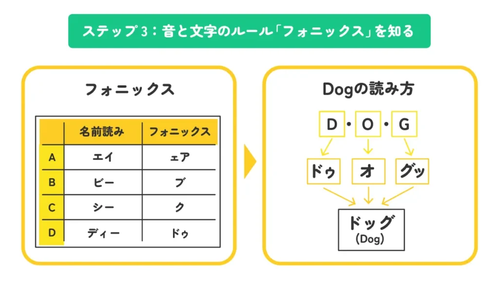 フォニックスを知っていれば、「D・O・G」を見たときに、「ドゥ」+「オ」+「グッ」 = 「ドッグ」と読むことができます。