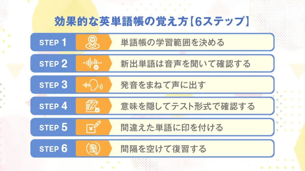 ここからは、最短ルートで語彙力を高める英単語帳の覚え方を解説します。順を追って見てみましょう。