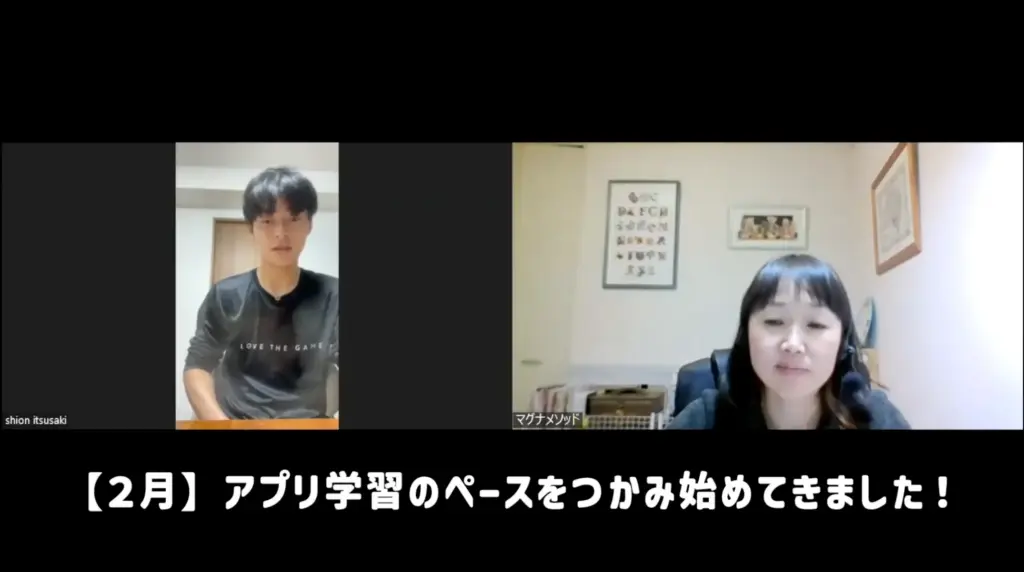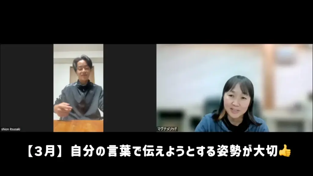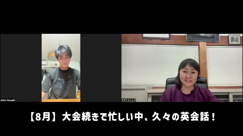 コーチングでの英会話にも慣れてきて、1ヶ月前には理解できていなかった単語やフレーズをきちんと理解して適切に返答できるようになるなど、小さな成長が所々で見られるようになりました。また、一問一答形式だけでなく会話のラリーが少しずつ続くようになったり、話題について自分の知っている単語で何とか説明しようとする「がむしゃらEnglish」がたくさん出てきたりして、コミュニケーション能力の高さが英語でのアウトプットの成長を大きく後押ししてくれていました。
